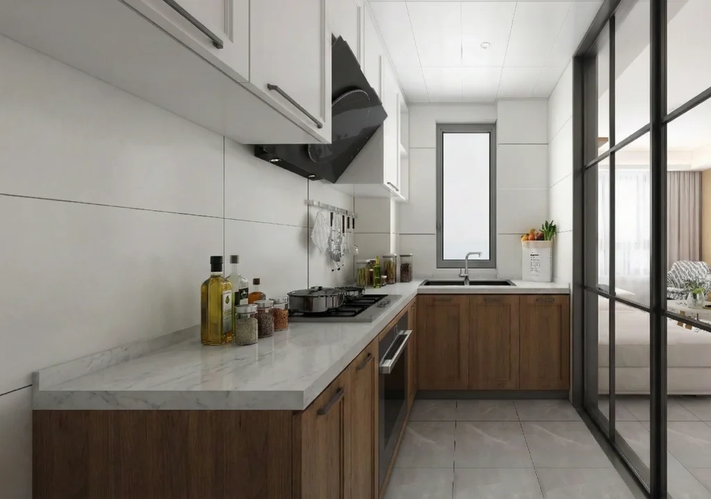 In a new residential complex in Lahore, 183 apartments are fitted with standardized yet highly practical kitchens. The exterior shows a crisp white mid-rise building with strong geometric balconies and angled forms. Inside, each unit features a compact L-shaped kitchen with white upper cabinets, warm wood lower cabinets, and a durable countertop. A tall window and glass partition door bring ample light into the space, while efficient storage and built-in appliances keep the layout neat and easy to maintain for everyday cooking.