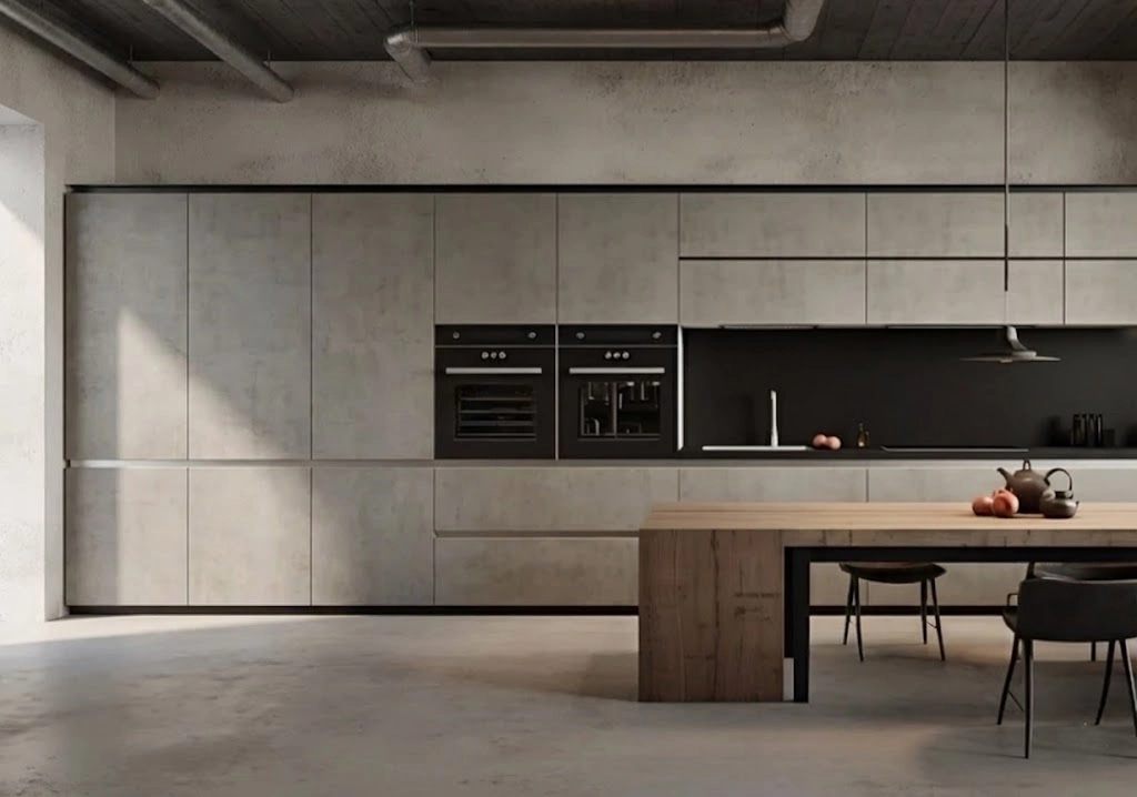 For a residential community in Denver, we supplied 32 sets of coordinated kitchen cabinets and bathroom vanities. The street view keeps the character of classic timber houses with a pitched roof and wrap-around porch, while the interiors shift to a calm, dark-toned minimalist kitchen. Matte graphite cabinets, warm wood accents, and a large island provide generous storage and a clean preparation surface, giving homeowners a modern, highly functional space that still respects the traditional architecture outside.